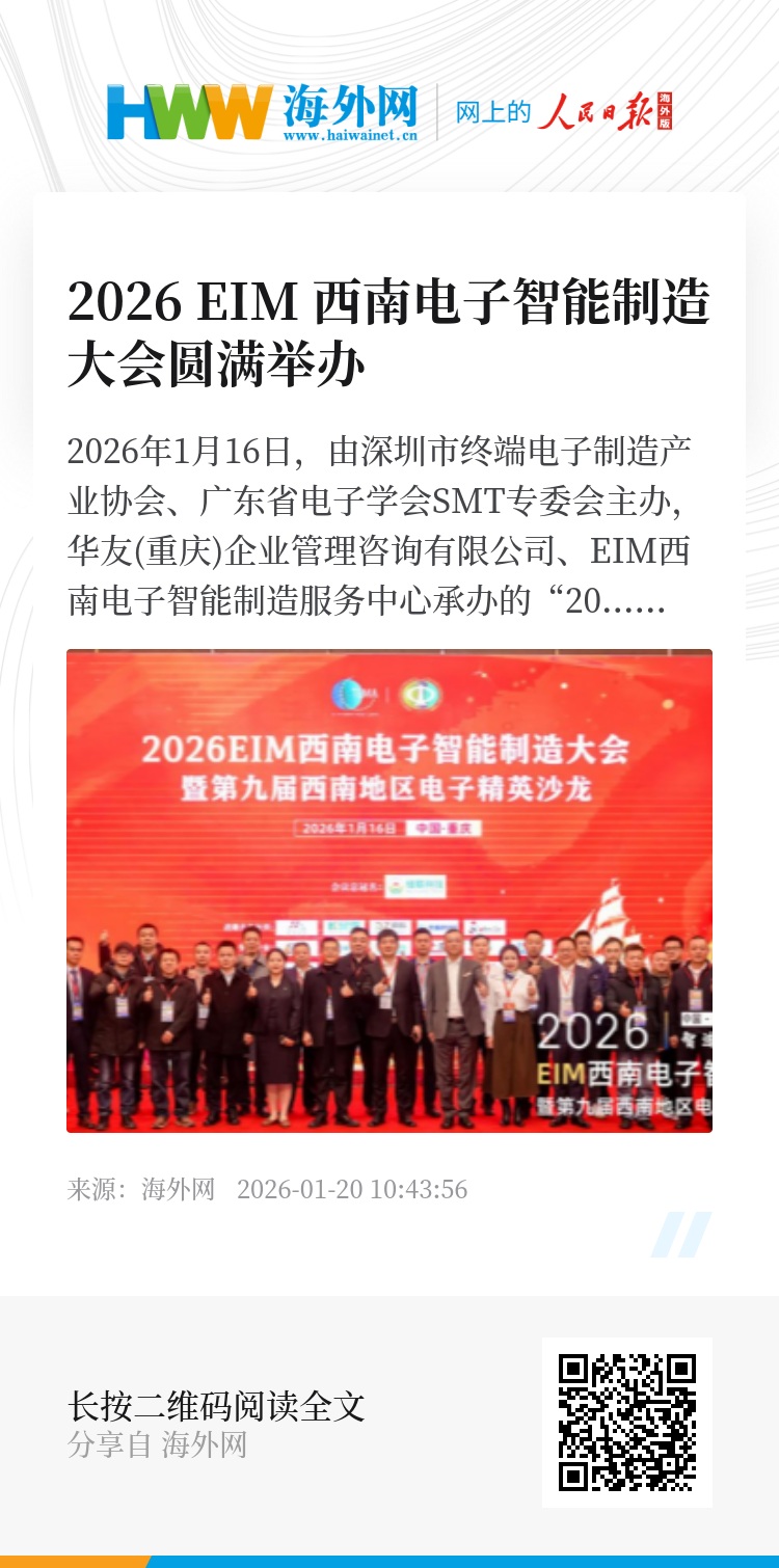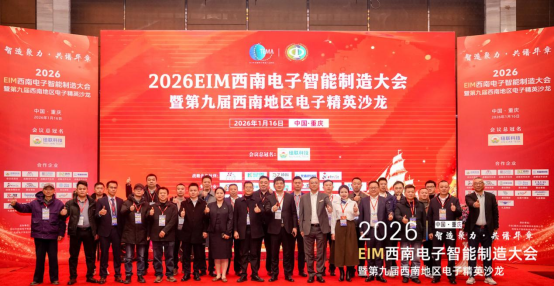 2026年1月16日,由深圳市终端电子制造产业协会、广东省电子学会SMT专委会主办,华友(重庆)企业管理咨询有限公司、EIM西南电子智能制造服务中心承办的“2026 EIM 西南电子智能制造大会暨第九届西南地区电子精英沙龙”在重庆两江新区瑞尔大酒店成功举办。