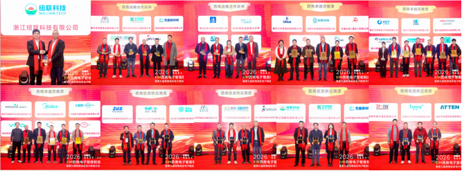 晚宴的颁奖典礼环节成为全场一大高潮,本次大会共颁发四大类奖项,包括会议总冠名企业1项、西南战略合作伙伴9项、2026西南卓越贡献奖17项及2026年度西南优质供应商奖12 项。其中,作为深耕机器视觉与工业自动化领域的领军企业,大会总冠名企业浙江纽联科技有限公司获特别表彰,其以强大的行业影响力与技术实力鼎力支持大会举办,打造的“硬件+ 算法+场景化解决方案” 一体化产品体系,为智能制造质量管控升级提供了核心支撑,在推动西南电子智能制造产业创新发展、搭建行业交流平台中作出了突出贡献,为行业树立了标杆榜样,该奖项由协会会长单位中兴通讯制造总工邱华盛先生受邀授予;西南战略合作伙伴、2026西南卓越贡献奖、2026年度西南优质供应商奖的获奖单位则涵盖电子制造、智能装备、新材料等多个领域,分别由深圳市终端电子制造产业协会执行会长汪勇、副秘书长李亚鹏,重庆市沙坪坝区人大常委会副主任邓朝霞,重庆市电子学会秘书长樊晓旭,四川省电子学会 SMT/MPT专委会秘书长苏兴菊,维沃移动通信(重庆)有限公司 SMT 总监刘胜刚等领导及企业代表依次颁奖。这些奖项的颁发,不仅表彰了在西南电子制造产业发展中作出突出贡献的企业与机构,也激励着更多行业主体投身技术创新与产业协同。