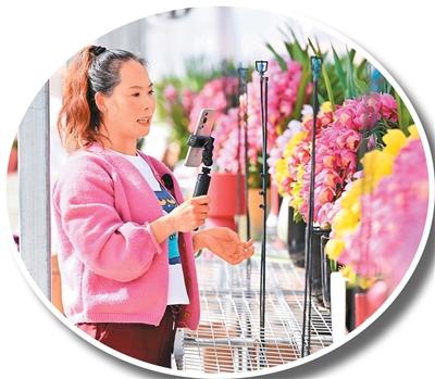 在周宁县七步镇的花卉大棚内,工作人员在通过直播推广销售大花蕙兰盆栽。