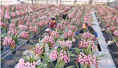 在福建省周宁县浦源镇的花卉大棚内,工人挑选大花蕙兰盆栽。