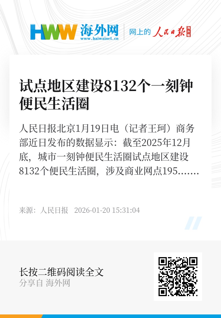 人民日报北京1月19日电(记者王珂)商务部近日发布的数据显示:截至2025年12月底,城市一刻钟便民生活圈试点地区建设8132个便民生活圈,涉及商业网点195.4万个,服务社区居民1.68亿人。