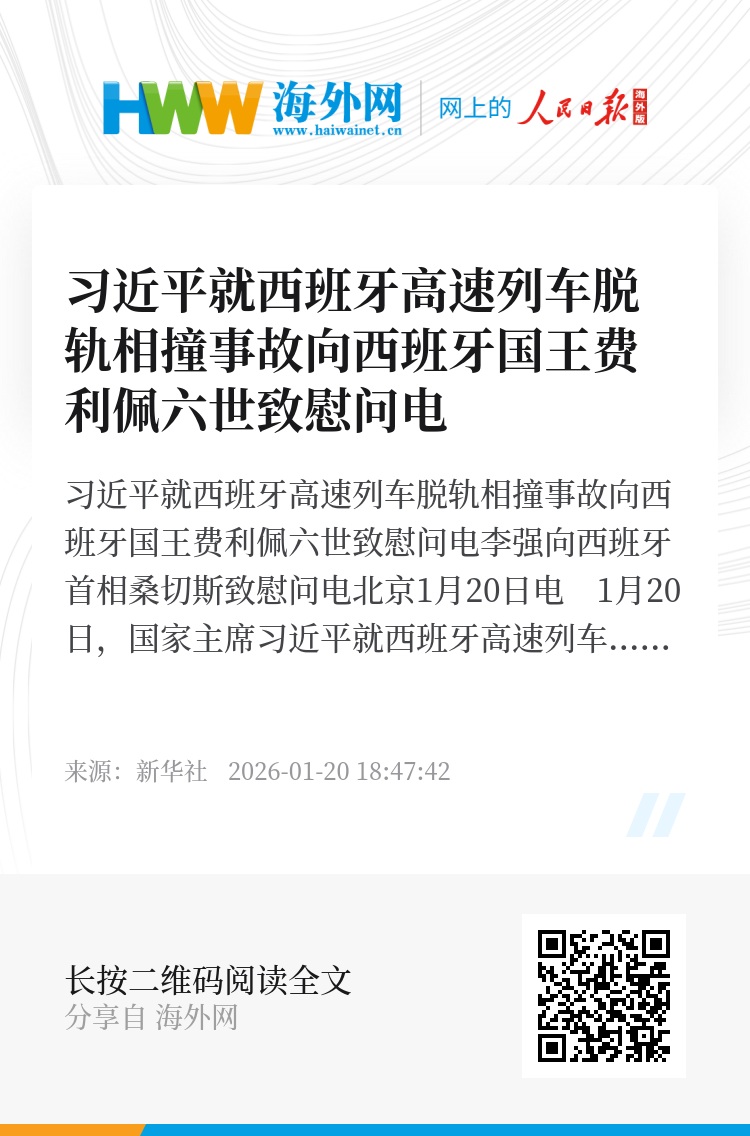 新华社北京1月20日电 1月20日,国家主席习近平就西班牙高速列车脱轨相撞事故向西班牙国王费利佩六世致慰问电。