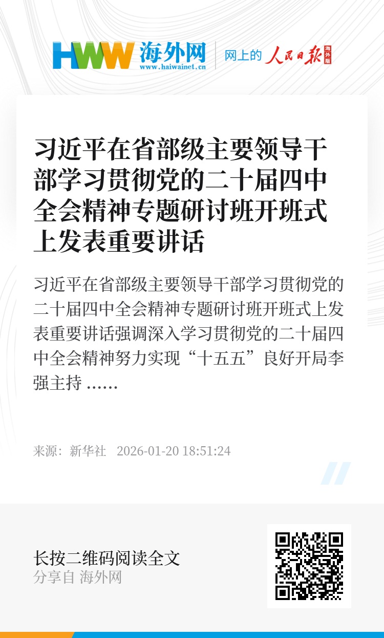 新华社北京1月20日电 省部级主要领导干部学习贯彻党的二十届四中全会精神专题研讨班20日上午在中央党校(国家行政学院)开班。中共中央总书记、国家主席、中央军委主席习近平在开班式上发表重要讲话强调,要把学习贯彻党的二十届四中全会精神不断引向深入,更好统一思想、凝心聚力,在党中央坚强领导下扎实做好各项工作,努力实现“十五五”良好开局。