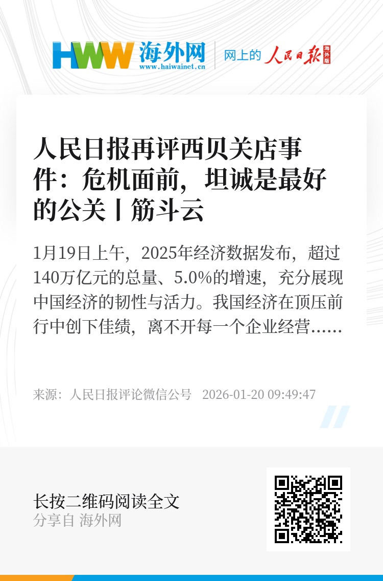 1月18日晚,“人民日报评论”公众号就西贝关店事件发表首篇评论,引发全网关注热议、转发转载,体现了网络舆论对主流媒体发出清醒理性声音的呼唤与期待。绝大多数网友留言中都有真挚的看法、建议,展现了营造良好网络舆论环境的主流主导。这表明,全社会在营造良好舆论环境、助力中国经济向新向优发展上有着高度共识。