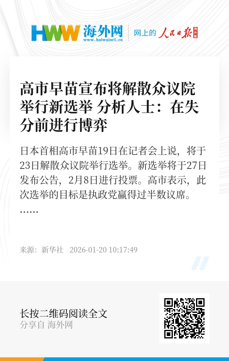 日本首相高市早苗19日在记者会上说,将于23日解散众议院举行选举。新选举将于27日发布公告,2月8日进行投票。