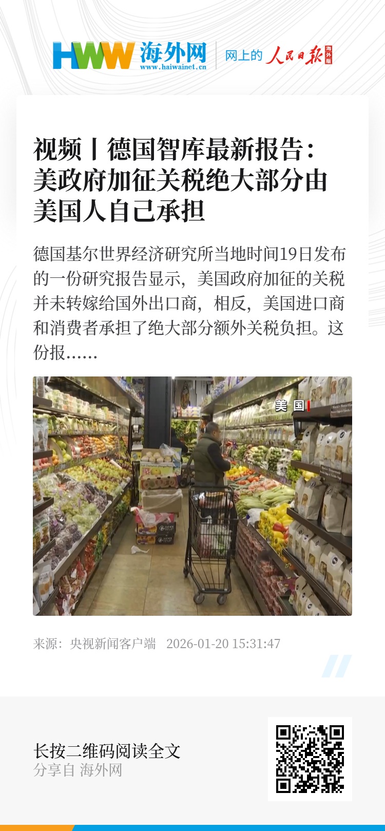 德国基尔世界经济研究所当地时间19日发布的一份研究报告显示,美国政府加征的关税并未转嫁给国外出口商,相反,美国进口商和消费者承担了绝大部分额外关税负担。