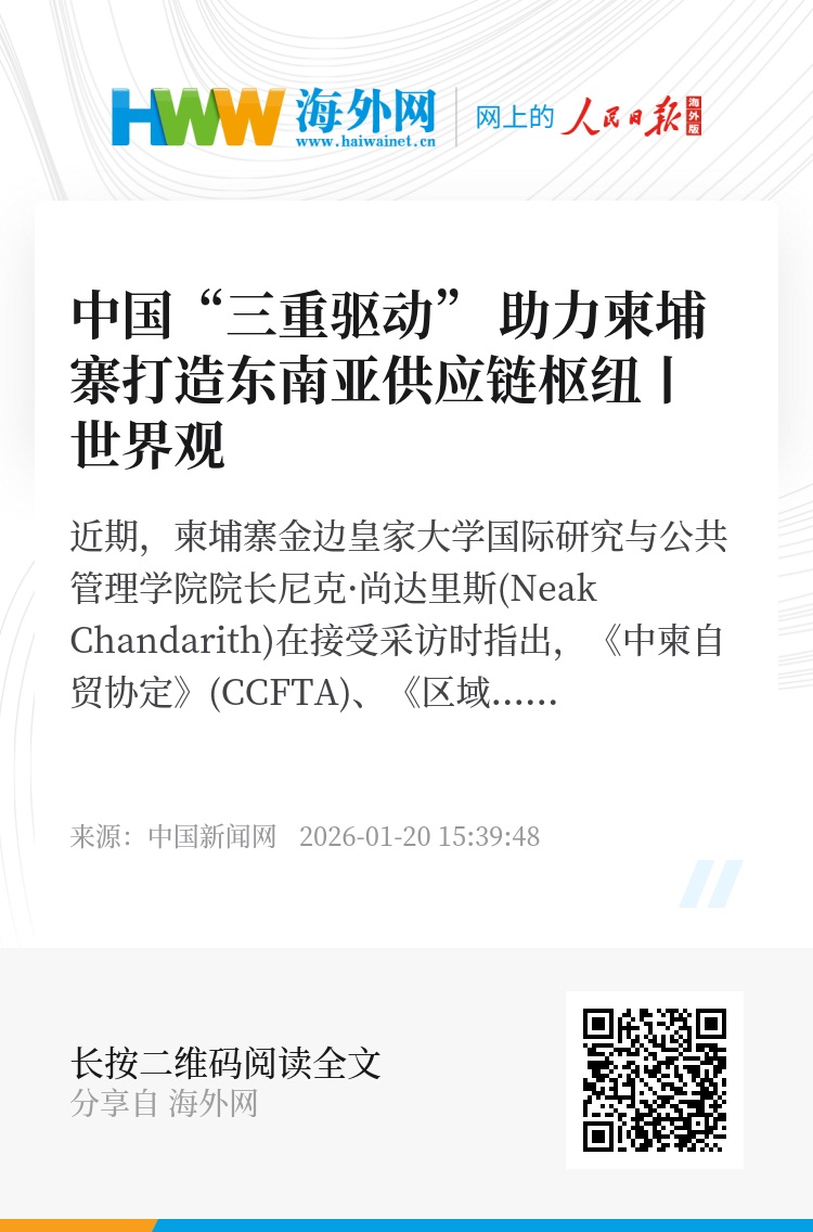 近期,柬埔寨金边皇家大学国际研究与公共管理学院院长尼克·尚达里斯(Neak Chandarith)在接受中新网采访时指出,《中柬自贸协定》(CCFTA)、《区域全面经济伙伴关系协定》(RCEP)及共建“一带一路”倡议正形成强大合力,将柬埔寨打造为东南亚供应链的关键节点。