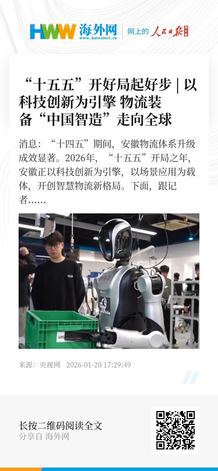 这家企业深耕电商快递、智能制造、机场物流等行业,国际市场聚焦智慧物流装备及解决方案,新年目标是海外营收占比突破50%,实现“产品出海”到“品牌出海”。企业负责人介绍,“十五五”是把握全球供应链变革和技术创新的关键窗口期,所以今年,企业重点推进人工智能、数字孪生还有先进传感器这些前沿领域的拓展,持续提升智能工厂的升级,以更低的成本、更高效的交付,助力中国“智造”走向全球。