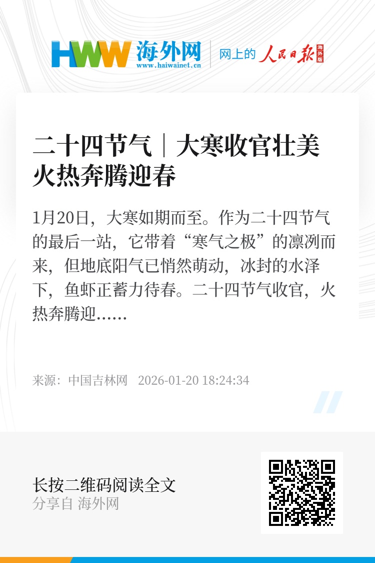 1月20日,大寒如期而至。作为二十四节气的最后一站,它带着“寒气之极”的凛冽而来,但地底阳气已悄然萌动,冰封的水泽下,鱼虾正蓄力待春。二十四节气收官,火热奔腾迎春。民俗里的年味渐浓,新时代的奋斗正酣,共同勾勒出一幅“收官壮阔、迎春奔腾”的时代图景。