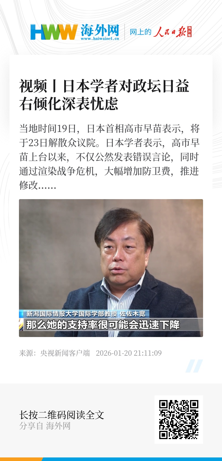 当地时间19日,日本首相高市早苗表示,将于23日解散众议院。日本学者表示,高市早苗上台以来,不仅公然发表错误言论,同时通过渲染战争危机,大幅增加防卫费,推进修改“和平宪法”,右倾化日趋严重,令人担忧。