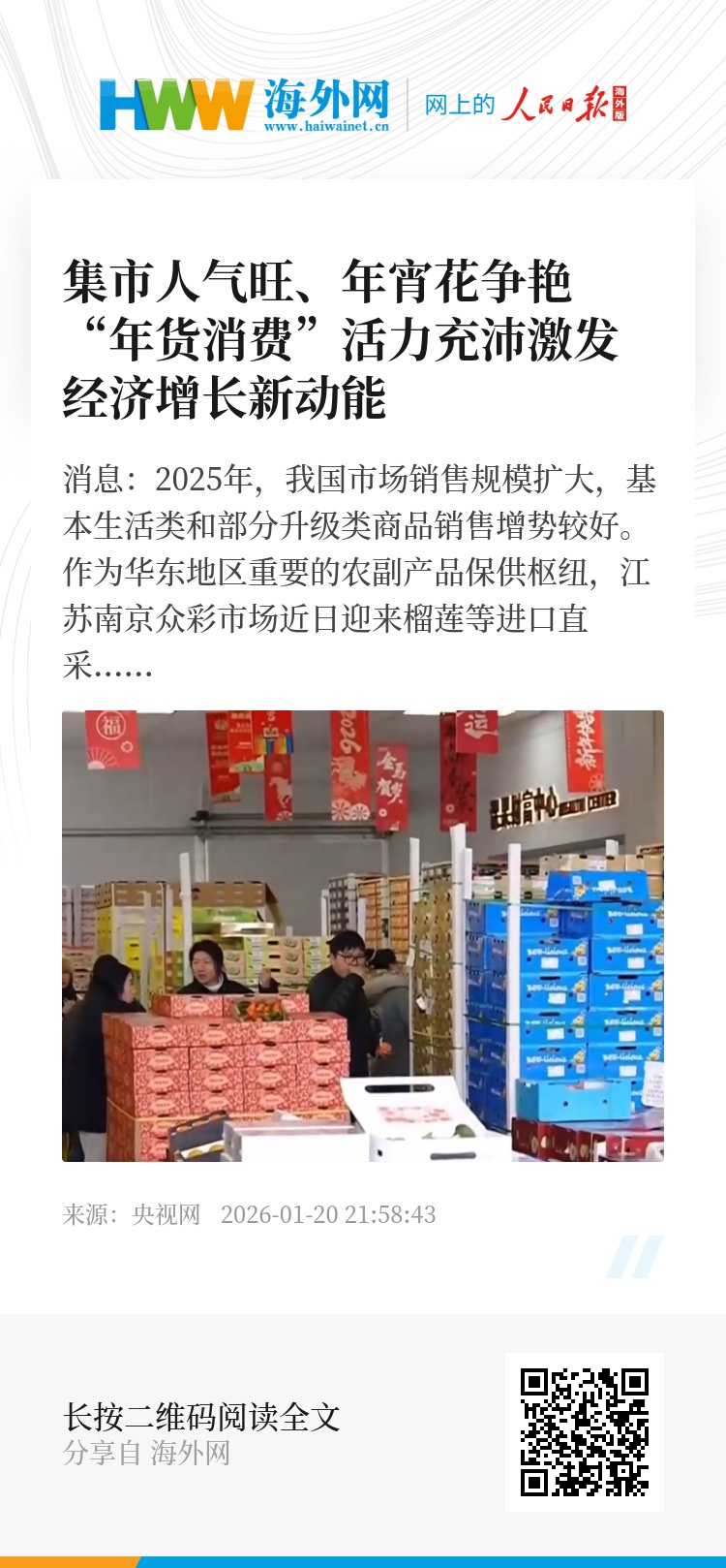 央视网消息:2025年,我国市场销售规模扩大,基本生活类和部分升级类商品销售增势较好。作为华东地区重要的农副产品保供枢纽,江苏南京众彩市场近日迎来榴莲等进口直采水果到货,销售火热。