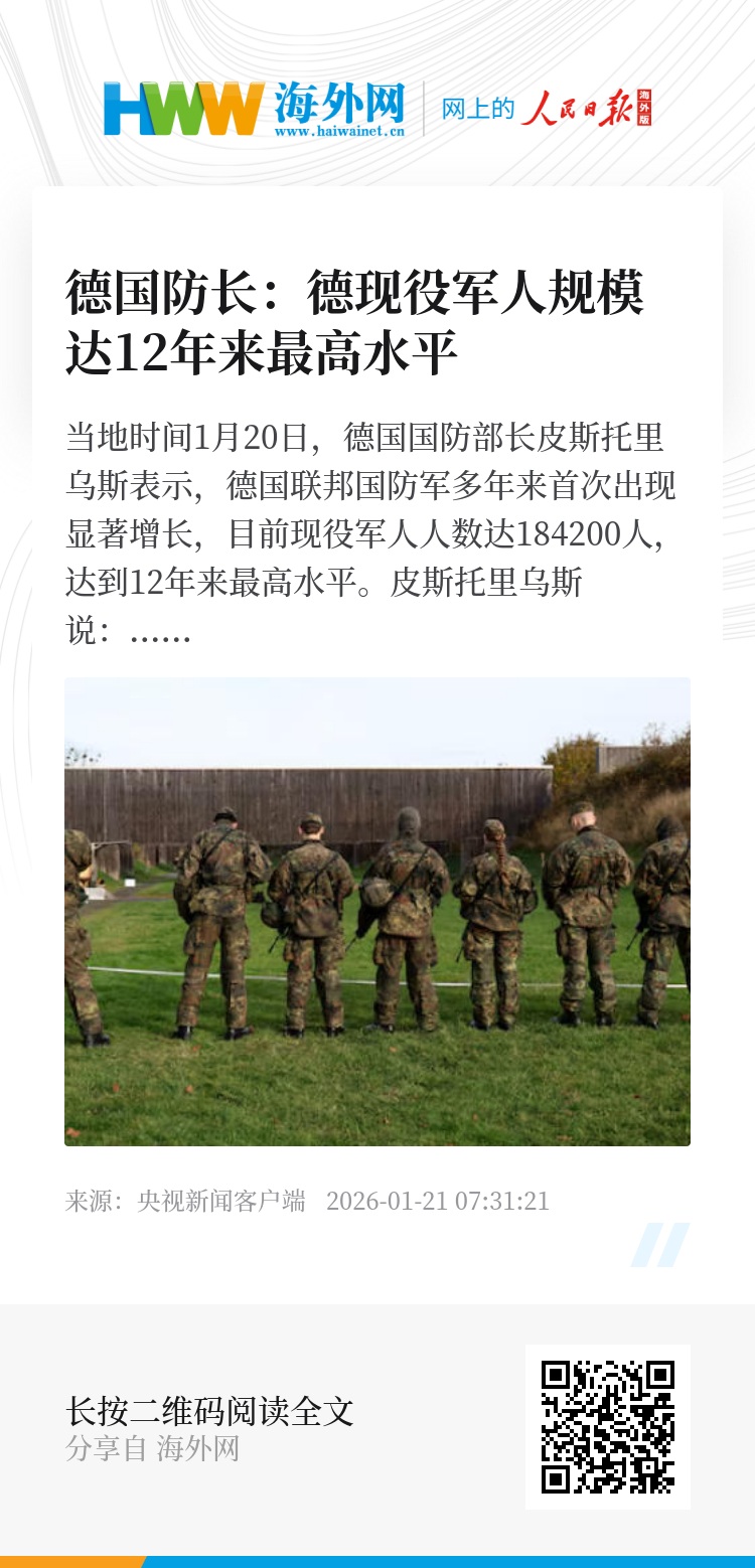 当地时间1月20日,德国国防部长皮斯托里乌斯表示,德国联邦国防军多年来首次出现显著增长,目前现役军人人数达184200人,达到12年来最高水平。
