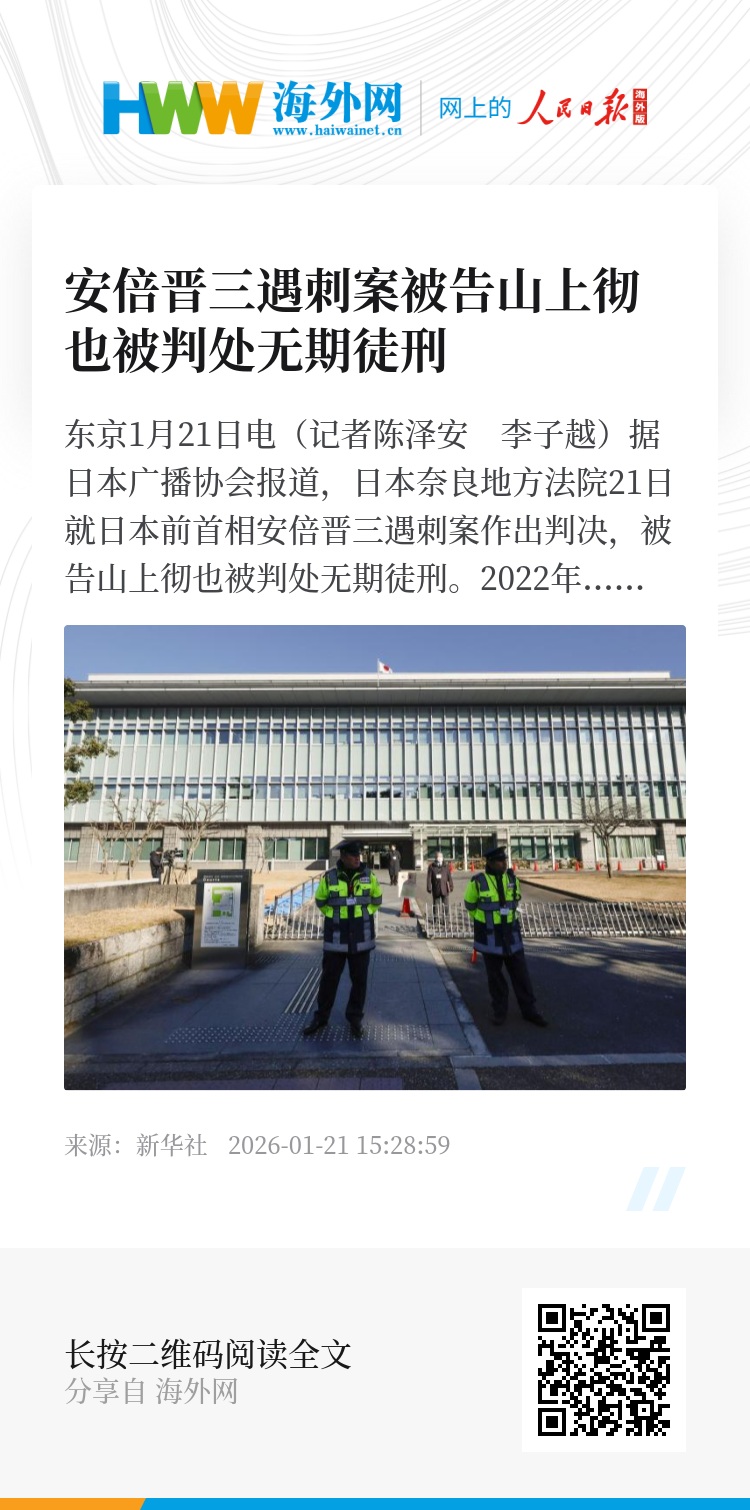 新华社东京1月21日电(记者陈泽安 李子越)据日本广播协会报道,日本奈良地方法院21日就日本前首相安倍晋三遇刺案作出判决,被告山上彻也被判处无期徒刑。