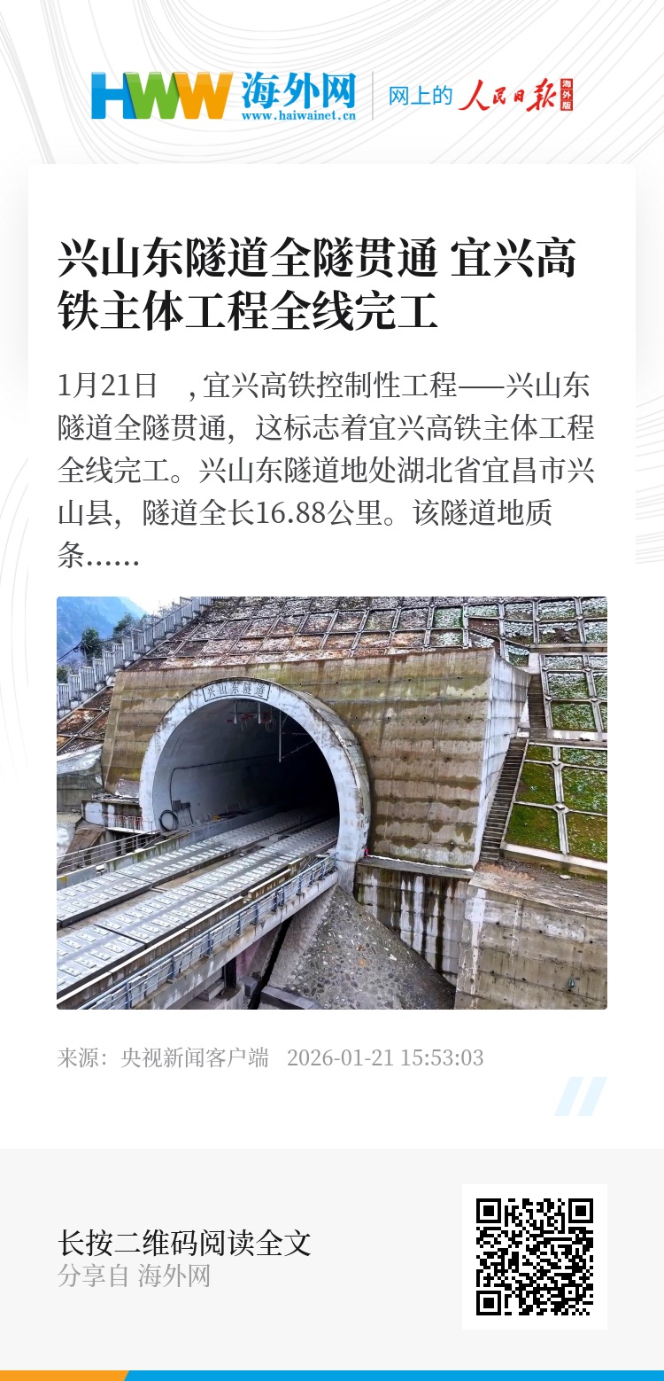 1月21日 ,宜兴高铁控制性工程——兴山东隧道全隧贯通,这标志着宜兴高铁主体工程全线完工。