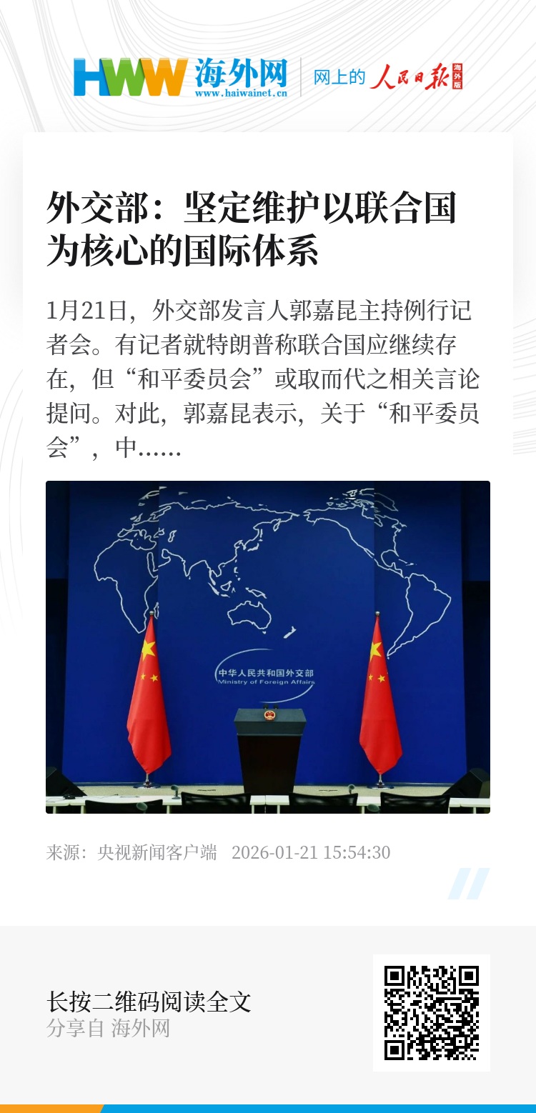 1月21日,外交部发言人郭嘉昆主持例行记者会。有记者就特朗普称联合国应继续存在,但“和平委员会”或取而代之相关言论提问。