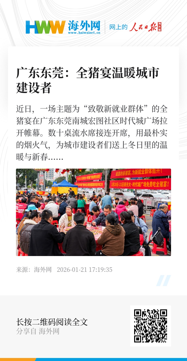 近日,一场主题为“致敬新就业群体”的全猪宴在广东东莞南城宏图社区时代城广场拉开帷幕。数十桌流水席接连开席,用最朴实的烟火气,为城市建设者们送上冬日里的温暖与新春的祝福。图源:视觉中国