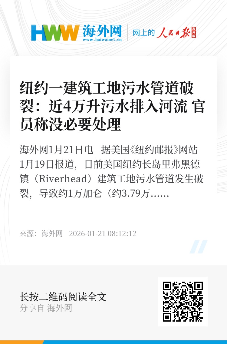 海外网1月21日电 据美国《纽约邮报》网站1月19日报道,日前美国纽约长岛里弗黑德镇(Riverhead)建筑工地污水管道发生破裂,导致约1万加仑(约3.79万升)未经处理的污水直接排进河流。