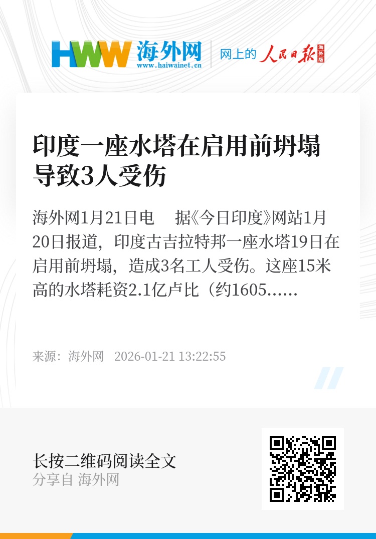 海外网1月21日电 据《今日印度》网站1月20日报道,印度古吉拉特邦一座水塔19日在启用前坍塌,造成3名工人受伤。