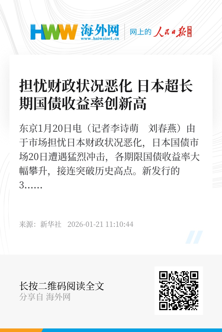新华社东京1月20日电(记者李诗萌 刘春燕)由于市场担忧日本财政状况恶化,日本国债市场20日遭遇猛烈冲击,各期限国债收益率大幅攀升,接连突破历史高点。
