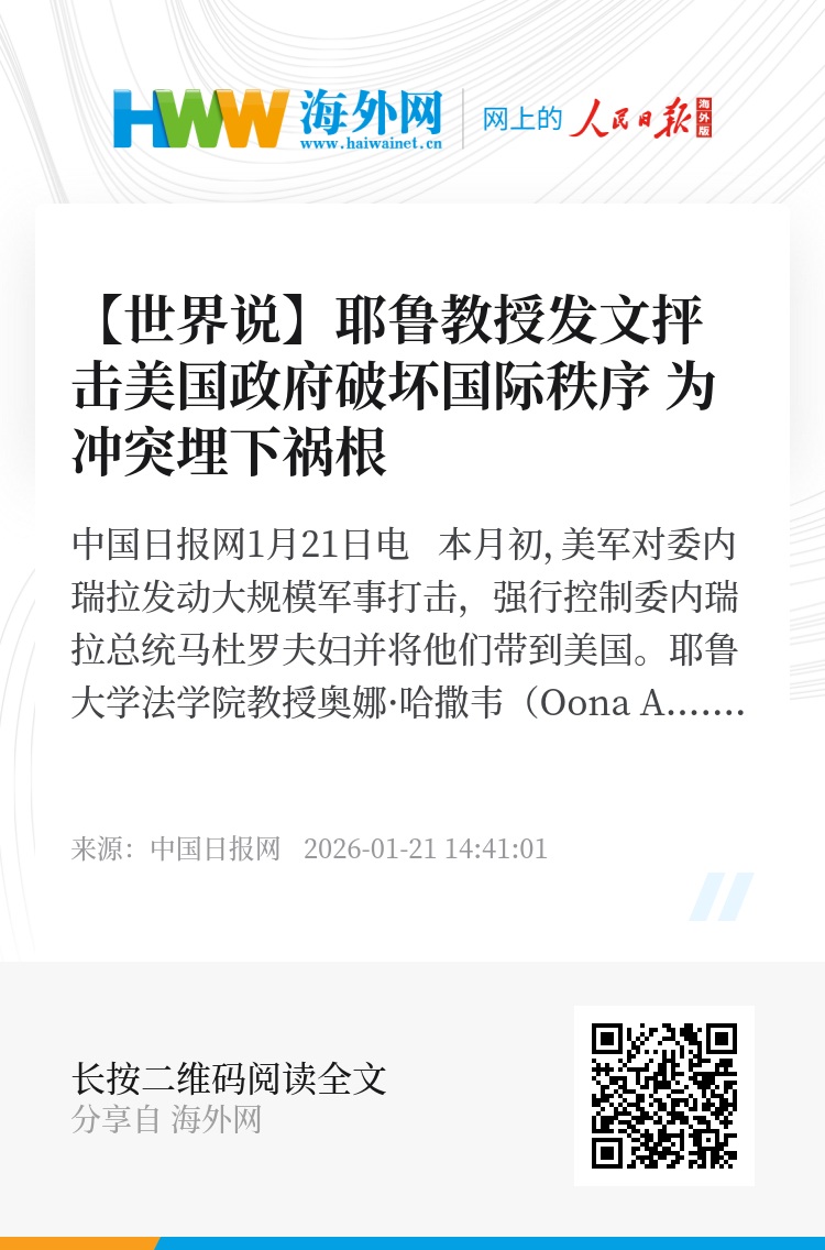 中国日报网1月21日电 本月初,美军对委内瑞拉发动大规模军事打击,强行控制委内瑞拉总统马杜罗夫妇并将他们带到美国。耶鲁大学法学院教授奥娜·哈撒韦(Oona A. Hathaway)和斯科特·夏皮罗(Scott J. Shapiro)在《外交事务》杂志网站撰文指出,美国这场未经联合国安理会授权、未经国会批准、不以自卫为由、甚至缺乏合理法律依据的军事行动,是对基于规则的国际秩序迄今最严重的破坏。