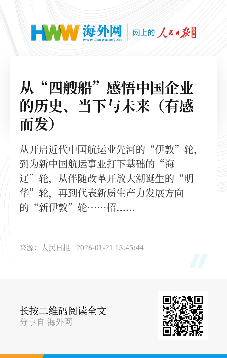 从开启近代中国航运业先河的“伊敦”轮,到为新中国航运事业打下基础的“海辽”轮,从伴随改革开放大潮诞生的“明华”轮,再到代表新质生产力发展方向的“新伊敦”轮……招商局的“四艘船”里,有百年老企的艰辛跋涉,也写着中国企业的历史、当下与未来。