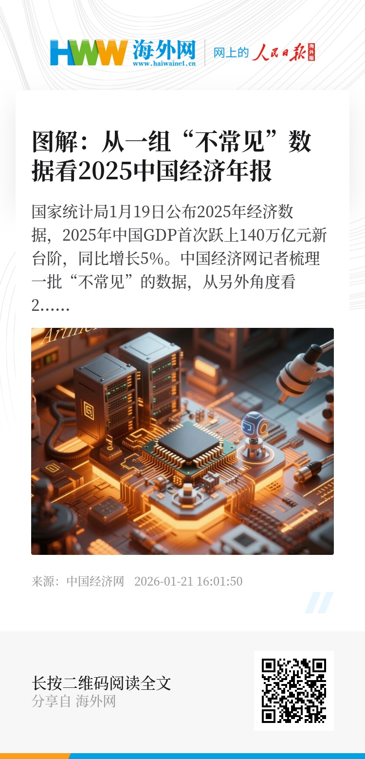 国家统计局1月19日公布2025年经济数据,2025年中国GDP首次跃上140万亿元新台阶,同比增长5%。中国经济网记者梳理一批“不常见”的数据,从另外角度看2025年中国经济“年报”。