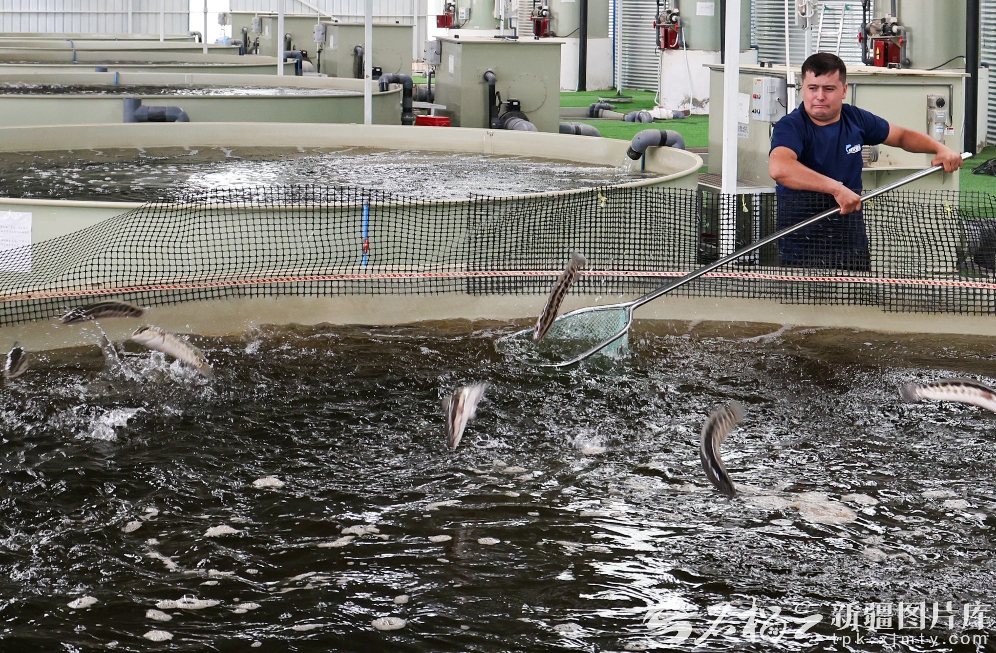 和田域见疆来水产养殖有限责任公司员工在对养殖池的黑鱼进行捕捞。许晓龙摄(资料图)