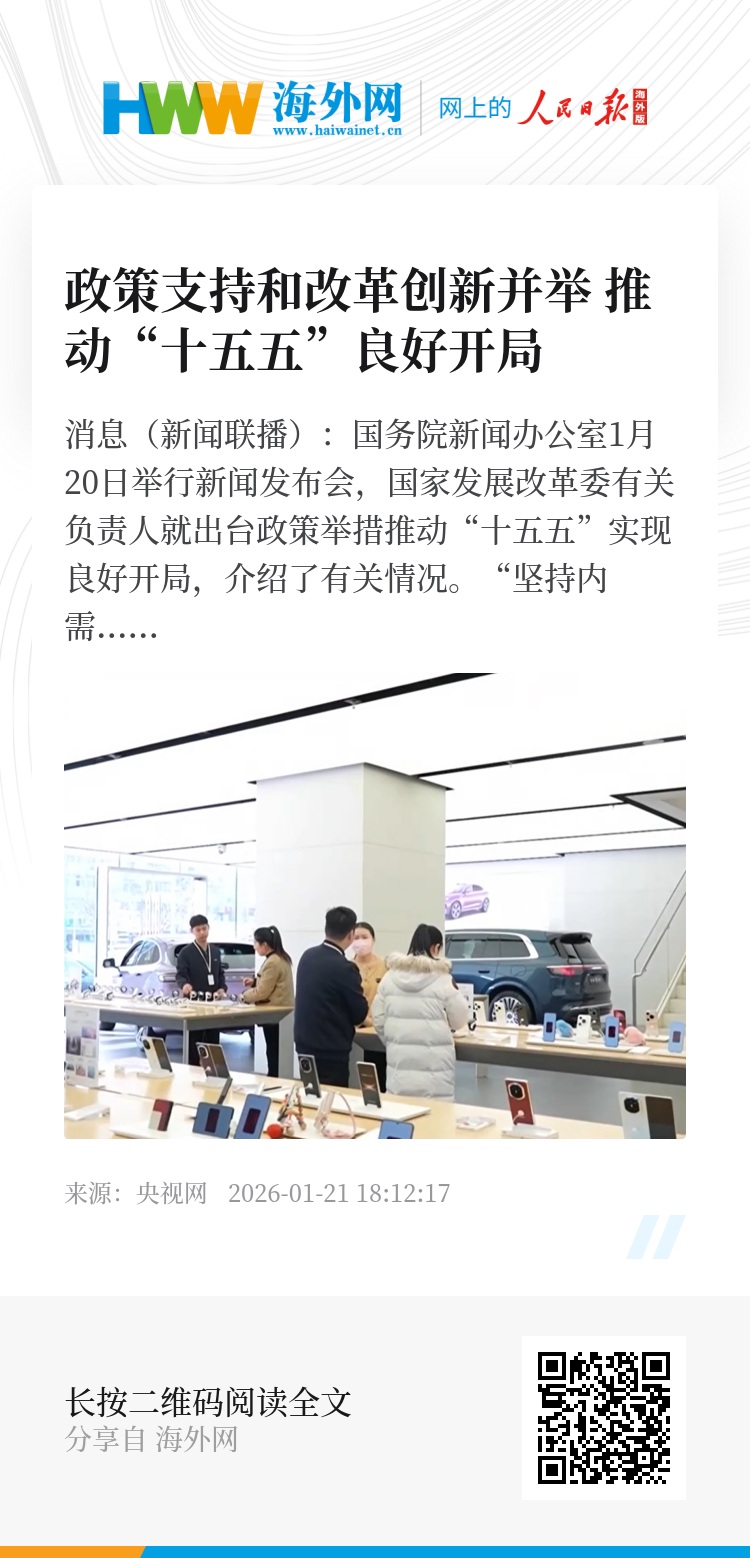 央视网消息(新闻联播):国务院新闻办公室1月20日举行新闻发布会,国家发展改革委有关负责人就出台政策举措推动“十五五”实现良好开局,介绍了有关情况。