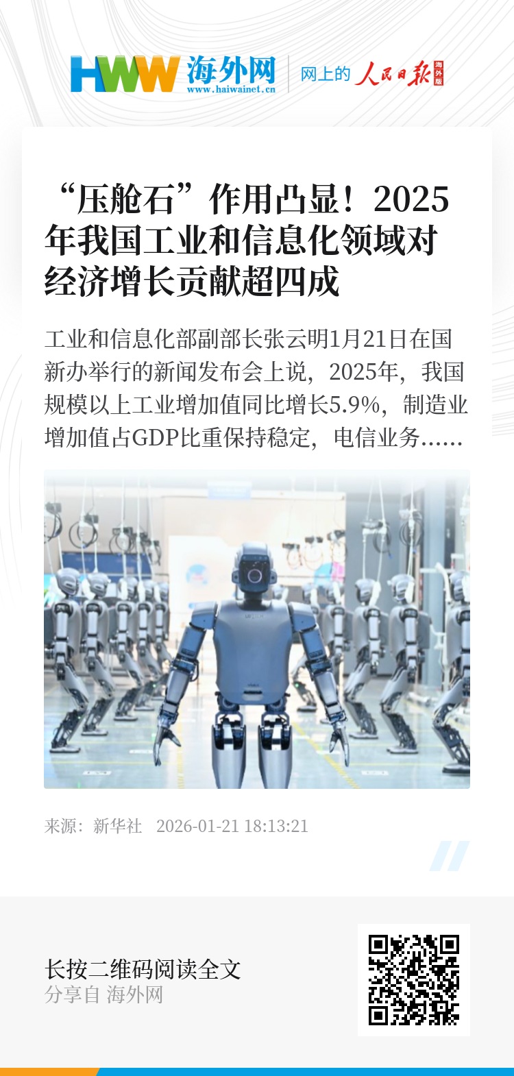 工业和信息化部副部长张云明1月21日在国新办举行的新闻发布会上说,2025年,我国规模以上工业增加值同比增长5.9%,制造业增加值占GDP比重保持稳定,电信业务总量同比增长9.1%。工业和信息化领域对经济增长的贡献超四成,有效发挥“压舱石”作用。