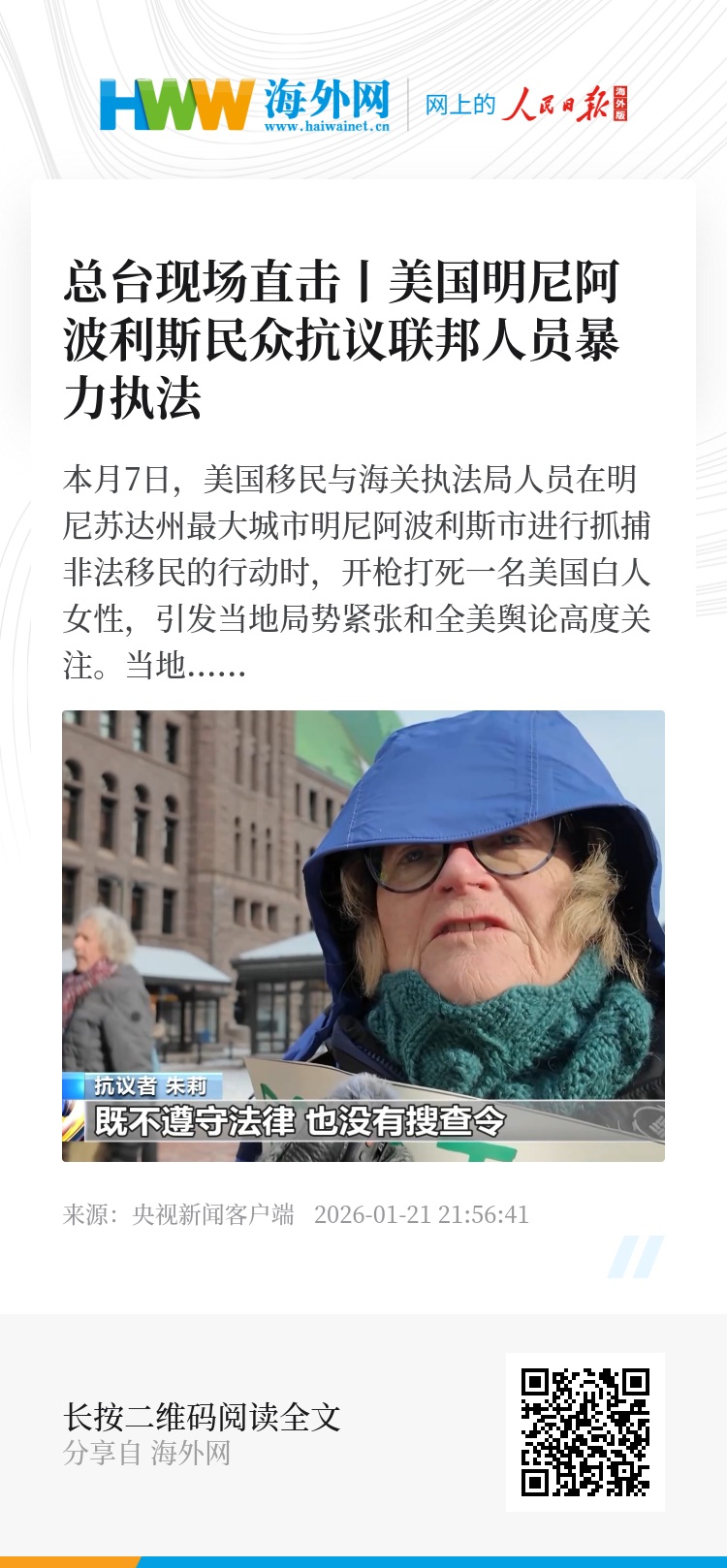 本月7日,美国移民与海关执法局人员在明尼苏达州最大城市明尼阿波利斯市进行抓捕非法移民的行动时,开枪打死一名美国白人女性,引发当地局势紧张和全美舆论高度关注。当地时间20日,明尼阿波利斯民众再次举行抗议,反对暴力执法。