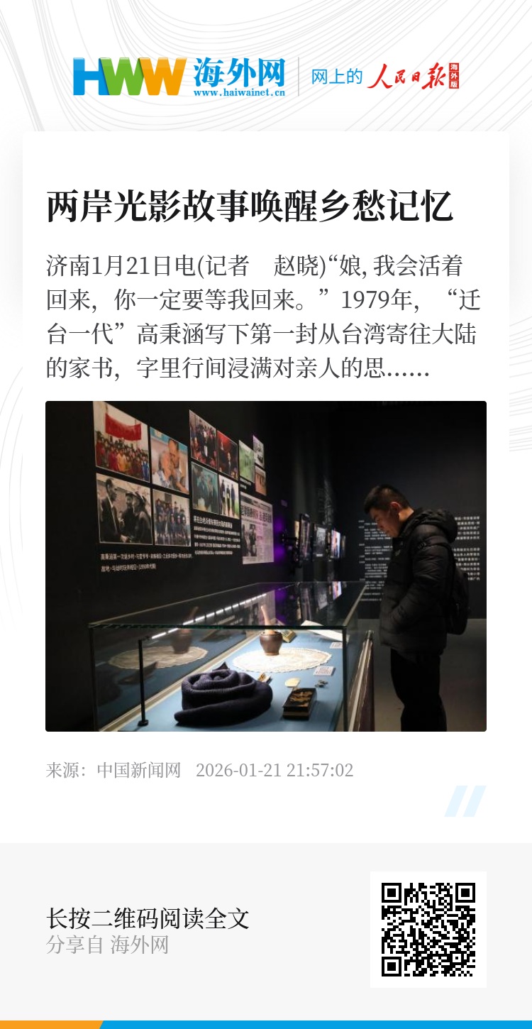 中新网济南1月21日电(记者 赵晓)“娘,我会活着回来,你一定要等我回来。”1979年,“迁台一代”高秉涵写下第一封从台湾寄往大陆的家书,字里行间浸满对亲人的思念。40多年后,这封家书在他的故乡山东展出,唤醒两岸乡愁记忆。