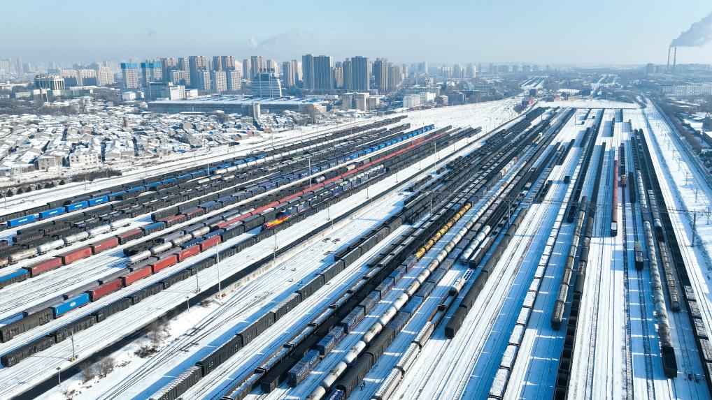 装满物资的货运列车在黑龙江省哈尔滨南站编组站场整装待发。“三九”天以来,针对北方降温降雪天气,中国铁路哈尔滨局集团有限公司哈尔滨南站积极开展电煤、生产物资保供专项行动,全力保障民生物资运输需求(2026年1月15日摄,无人机照片)。新华社发(原勇 摄)