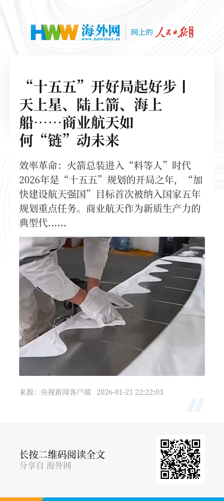像这家企业一样,如今,由商业航天汇聚而成的创新力量,正奔向同一个目的地——海南文昌。在那里,中国首个商业航天发射场,正以未来年发射次数超60发的规划能力,成为牵引整条产业链的“新母港”,有望形成“百箭千星”的发射格局。