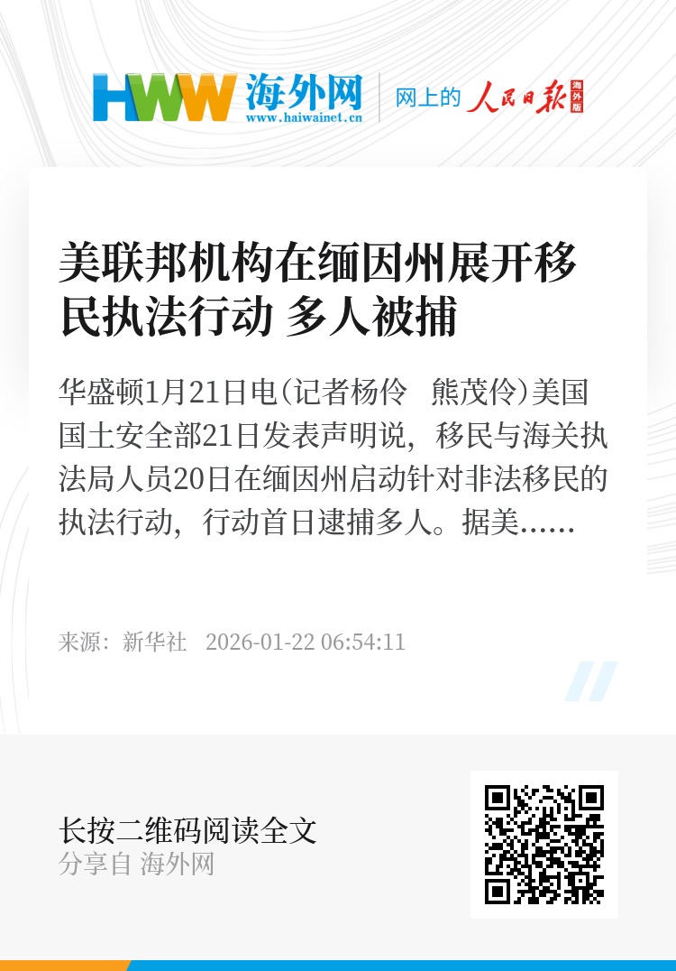新华社华盛顿1月21日电(记者杨伶 熊茂伶)美国国土安全部21日发表声明说,移民与海关执法局人员20日在缅因州启动针对非法移民的执法行动,行动首日逮捕多人。