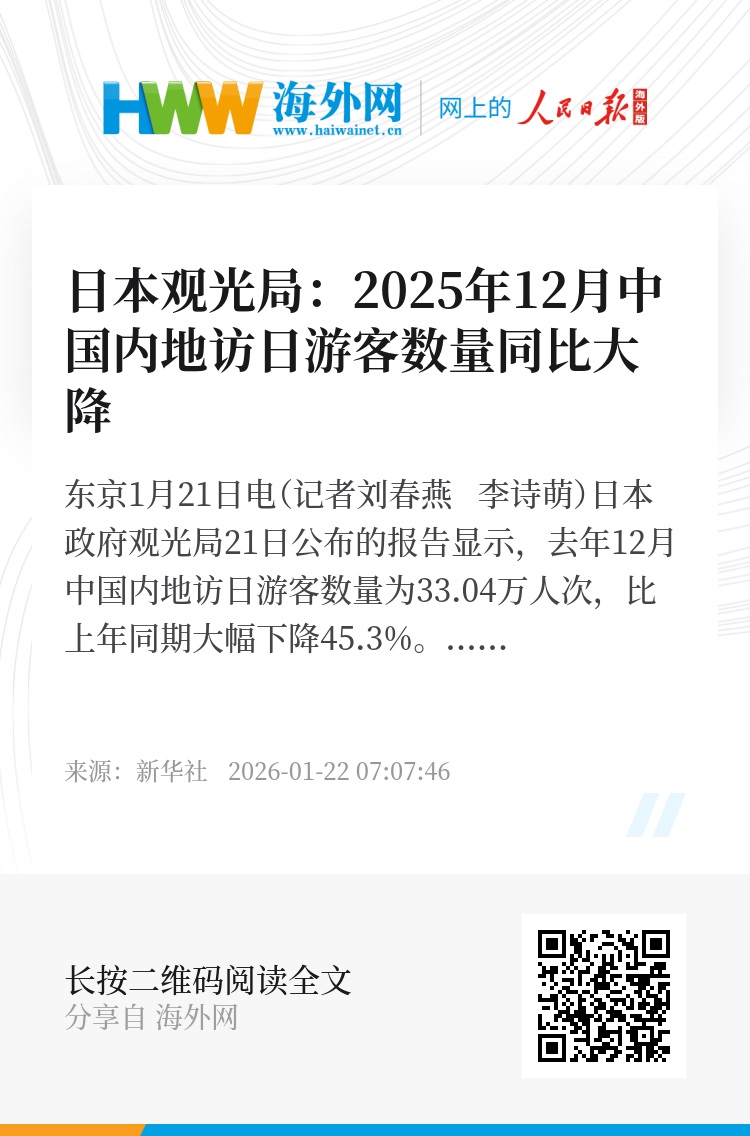 新华社东京1月21日电(记者刘春燕 李诗萌)日本政府观光局21日公布的报告显示,去年12月中国内地访日游客数量为33.04万人次,比上年同期大幅下降45.3%。