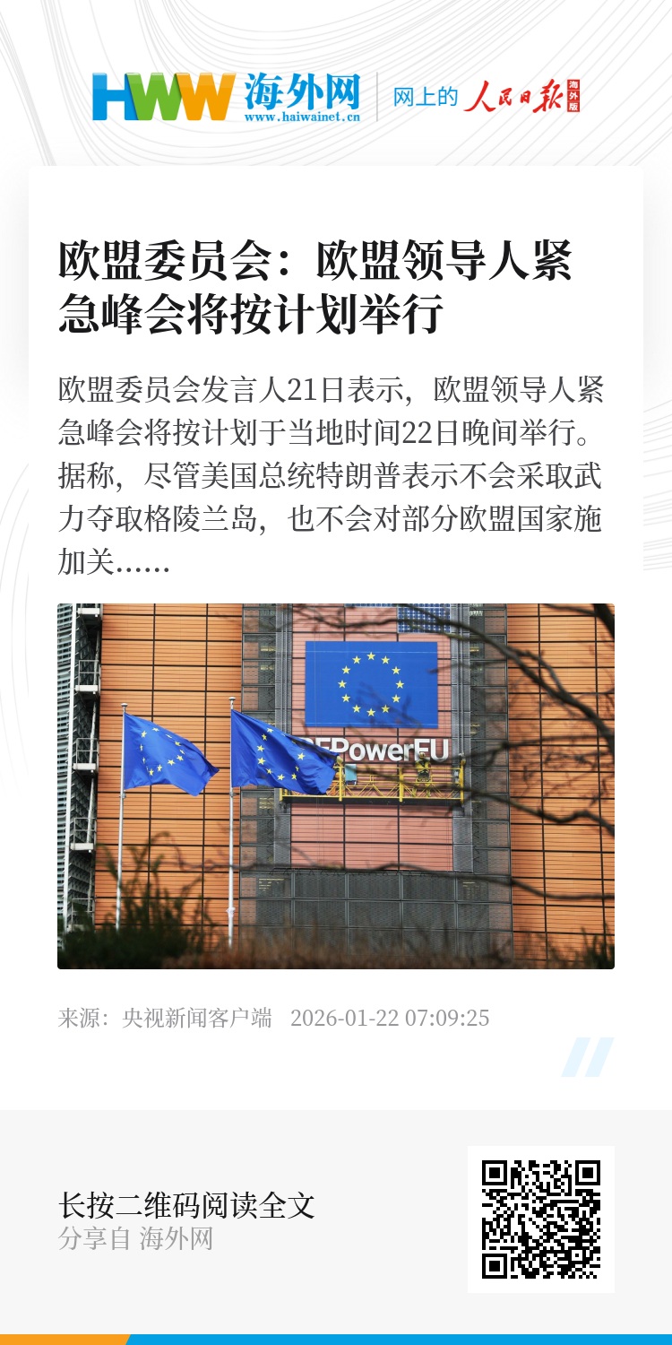欧盟委员会发言人21日表示,欧盟领导人紧急峰会将按计划于当地时间22日晚间举行。据称,尽管美国总统特朗普表示不会采取武力夺取格陵兰岛,也不会对部分欧盟国家施加关税,但欧盟方面仍将继续推进相关会议安排。