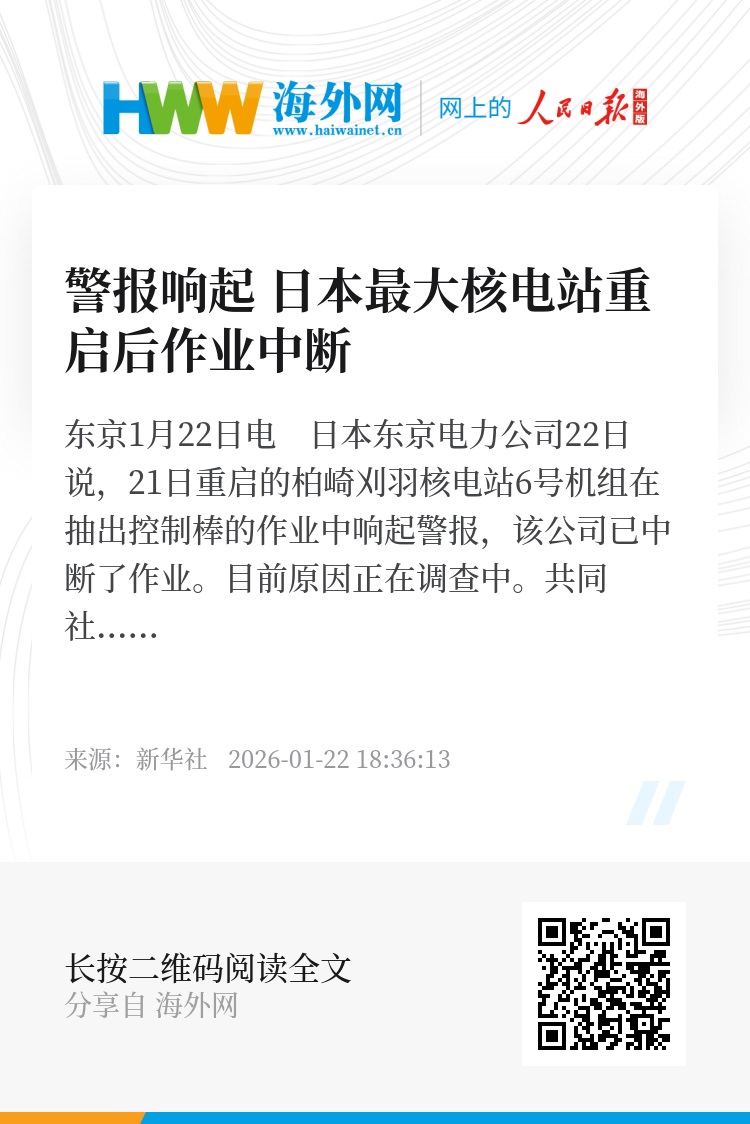 新华社东京1月22日电 日本东京电力公司22日说,21日重启的柏崎刈羽核电站6号机组在抽出控制棒的作业中响起警报,该公司已中断了作业。目前原因正在调查中。