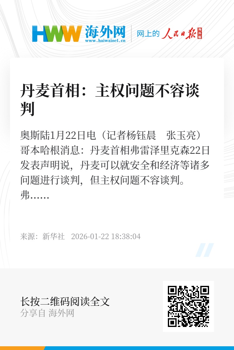 新华社奥斯陆1月22日电(记者杨钰晨 张玉亮)哥本哈根消息:丹麦首相弗雷泽里克森22日发表声明说,丹麦可以就安全和经济等诸多问题进行谈判,但主权问题不容谈判。