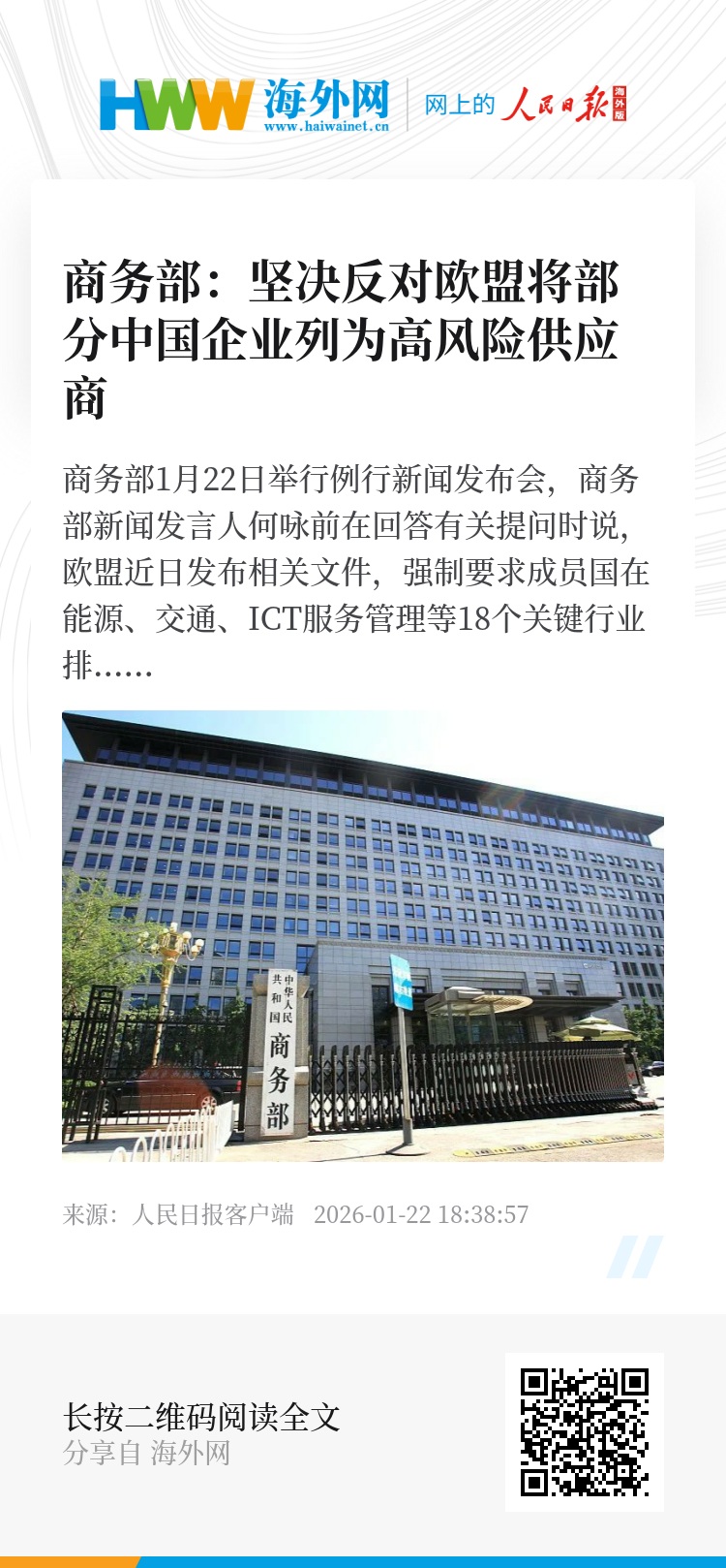 商务部1月22日举行例行新闻发布会,商务部新闻发言人何咏前在回答有关提问时说,欧盟近日发布相关文件,强制要求成员国在能源、交通、ICT服务管理等18个关键行业排除所谓“高风险供应商”。中方对此表示严重关切。中国企业长期在欧洲依法合规经营,为欧洲民众提供了优质的产品和服务,有力促进了欧洲电信和数字产业发展。然而,欧盟却在毫无事实依据的情况下,将部分中国企业列为高风险供应商,限制中国企业参与5G建设。我们坚决反对欧方对中国企业的歧视行为和将经贸问题政治化、泛安全化的错误做法。