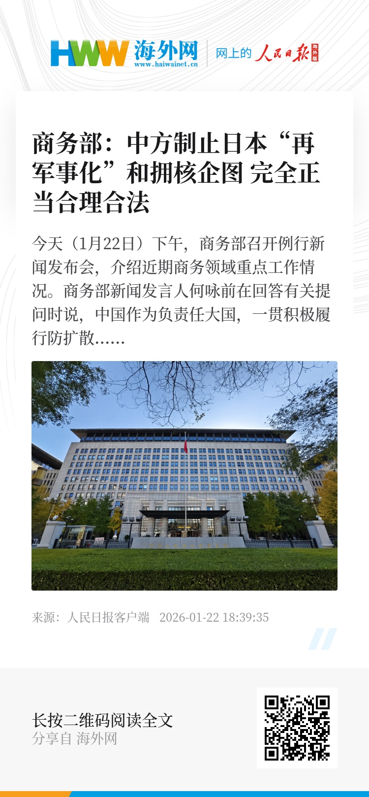 商务部新闻发言人何咏前在回答有关提问时说,中国作为负责任大国,一贯积极履行防扩散国际义务。依法依规针对所有两用物项,禁止对日本军事用户、军事用途,以及一切参与提升日本军事实力的最终用户用途出口,其目的是制止“再军事化”和拥核企图,完全正当、合理、合法。与此同时,中方始终致力于维护全球产供链稳定与安全,出口管制申请和审核等程序均依法合规。在此,我愿再次重申对符合确保署民事用途等条件的出口申请都会得到批准。
