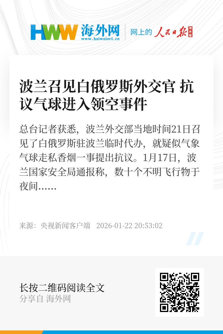 总台记者获悉,波兰外交部当地时间21日召见了白俄罗斯驻波兰临时代办,就疑似气象气球走私香烟一事提出抗议。