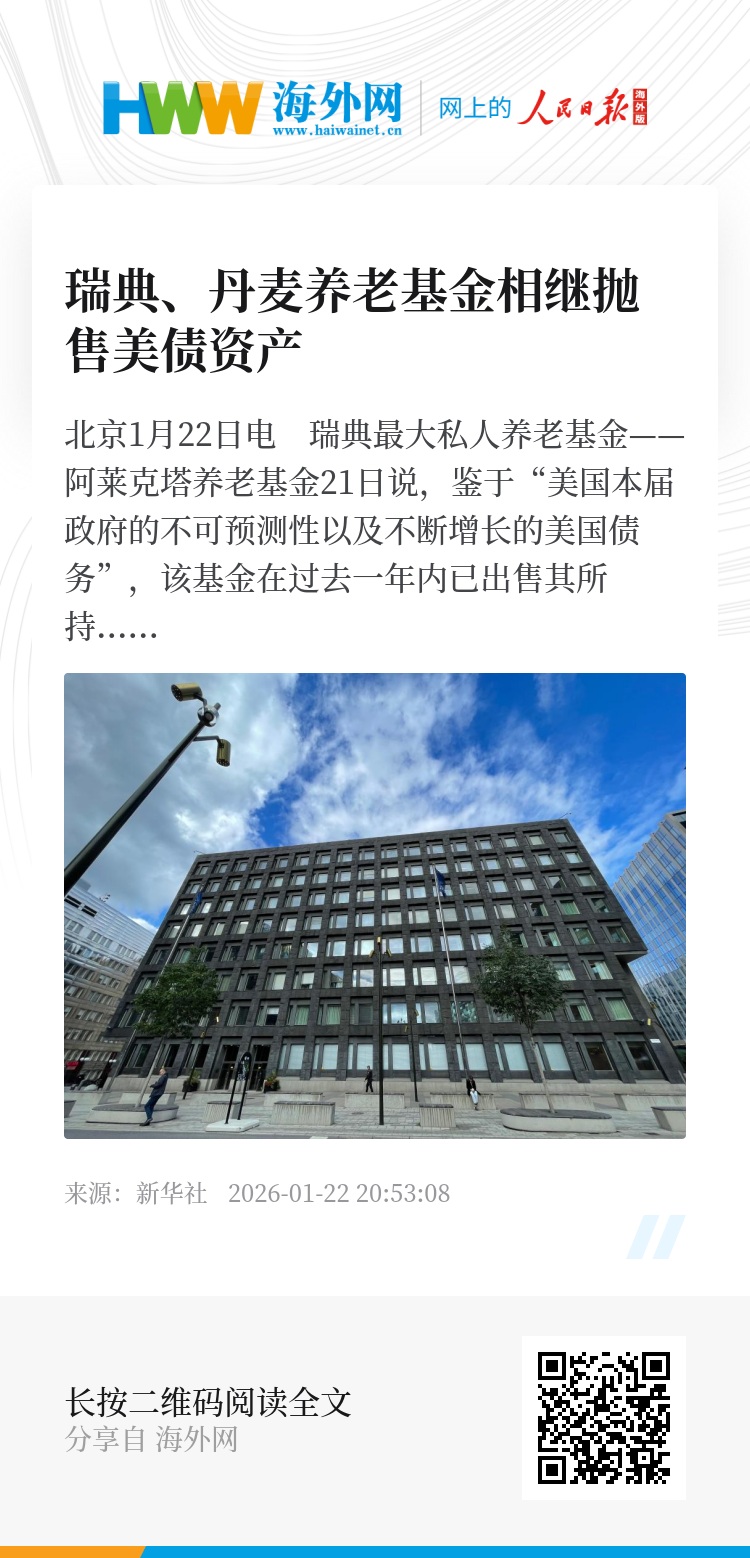 新华社北京1月22日电 瑞典最大私人养老基金——阿莱克塔养老基金21日说,鉴于“美国本届政府的不可预测性以及不断增长的美国债务”,该基金在过去一年内已出售其所持有的大部分美国国债。