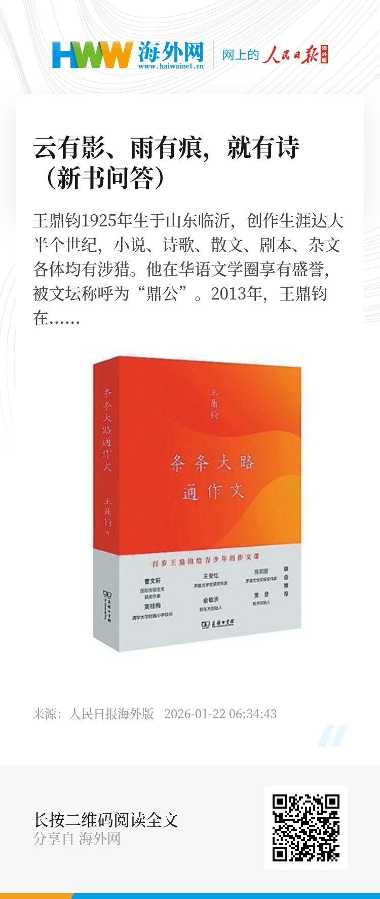 王鼎钧1925年生于山东临沂,创作生涯达大半个世纪,小说、诗歌、散文、剧本、杂文各体均有涉猎。他在华语文学圈享有盛誉,被文坛称呼为“鼎公”。2013年,王鼎钧在大陆出版四册回忆录《昨天的云》《怒目少年》《关山夺路》《文学江湖》,轰动一时。近些年,他致力于将毕生为学为文的心得传授给年轻一代,相继出版《小学作文讲话》《作文七巧》《作文十九问》《文学种子》《讲理》《古文观止化读》作文六书。百岁高龄时,他又推出新书《条条大路通作文》,启发小读者从一只鸟、一条鱼、一本书、一场梦中寻找灵感,记录生活。近日,本报记者围绕这本新书对王鼎钧进行了专访。