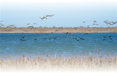 越冬候鸟在山东黄河三角洲国家级自然保护区飞翔。