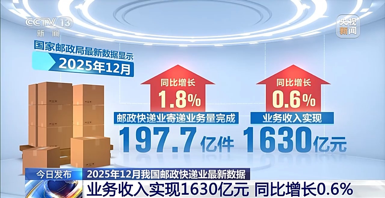 国家邮政局最新数据显示,2025年12月,我国邮政快递业寄递业务量完成197.7亿件,同比增长1.8%;业务收入实现1630亿元,同比增长0.6%。