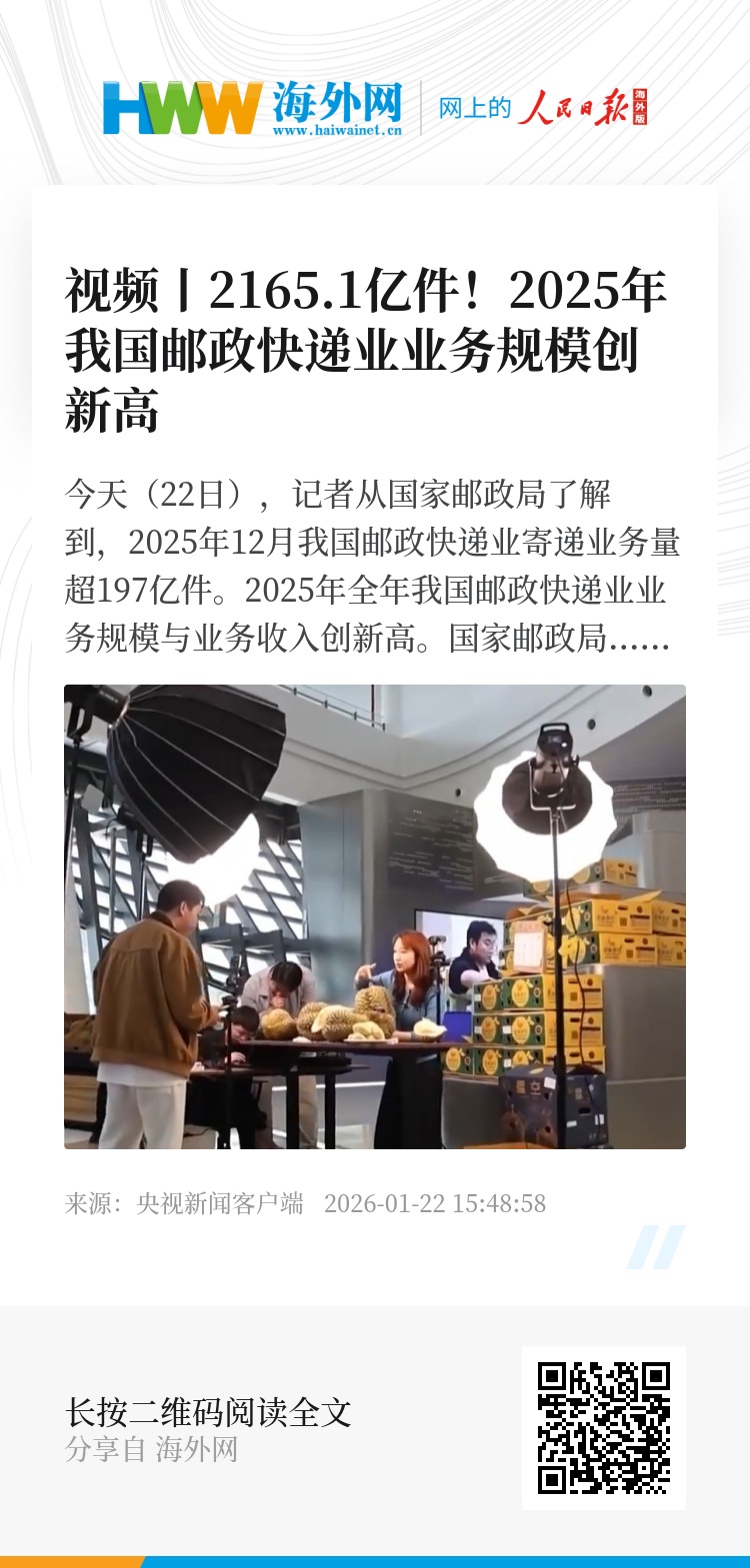 今天(22日),记者从国家邮政局了解到,2025年12月我国邮政快递业寄递业务量超197亿件。2025年全年我国邮政快递业业务规模与业务收入创新高。