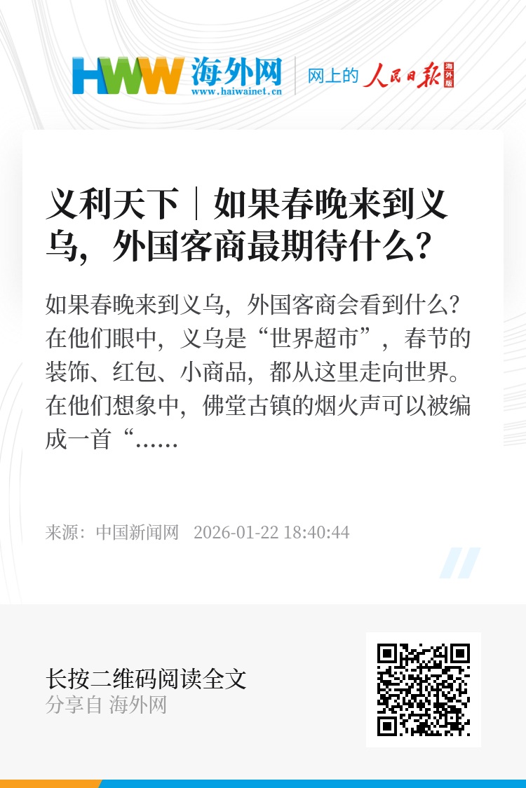 如果春晚来到义乌,外国客商会看到什么?在他们眼中,义乌是“世界超市”,春节的装饰、红包、小商品,都从这里走向世界。在他们想象中,佛堂古镇的烟火声可以被编成一首“生活交响曲”;绣湖的灯影、大安寺塔的记忆,讲述这座城市的历史。而在全球数贸中心,无人机与AI,正在用多国语言,向世界送上新年的祝福。(陈庆洋 赵一力)