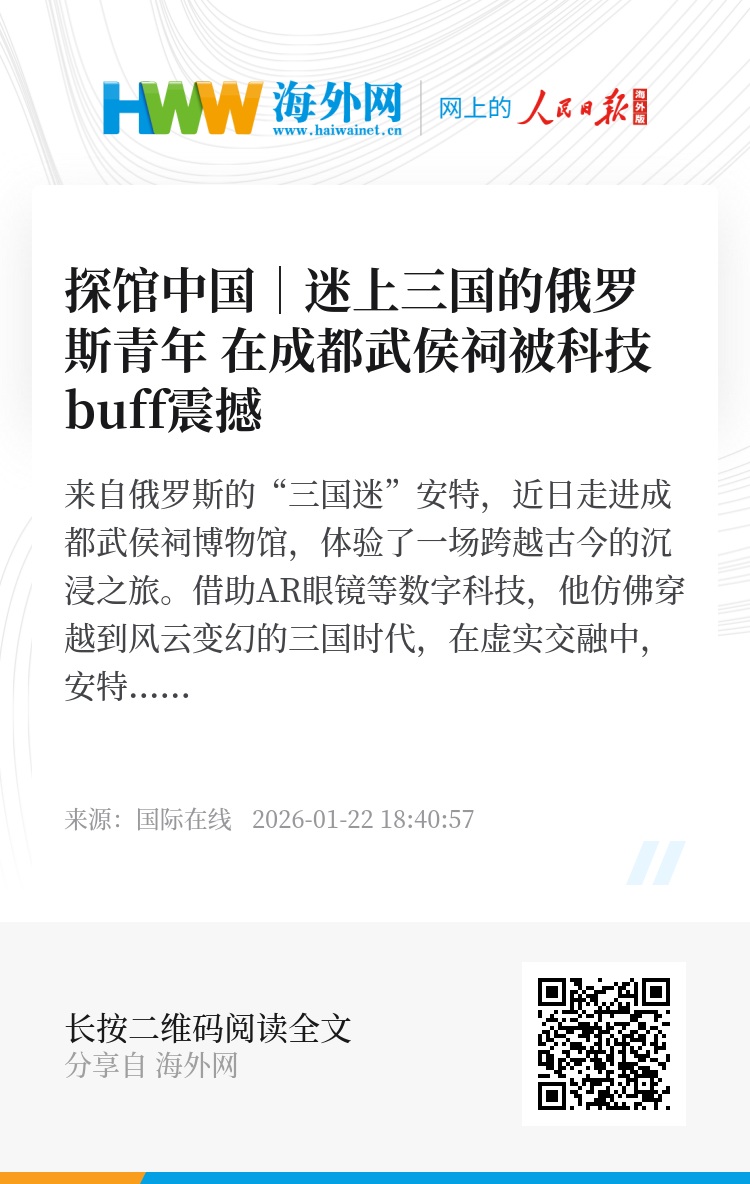 来自俄罗斯的“三国迷”安特,近日走进成都武侯祠博物馆,体验了一场跨越古今的沉浸之旅。借助AR眼镜等数字科技,他仿佛穿越到风云变幻的三国时代,在虚实交融中,安特不仅更深入了解了刘备与诸葛亮的动人故事,更深深被这种科技赋能的文化体验所震撼。