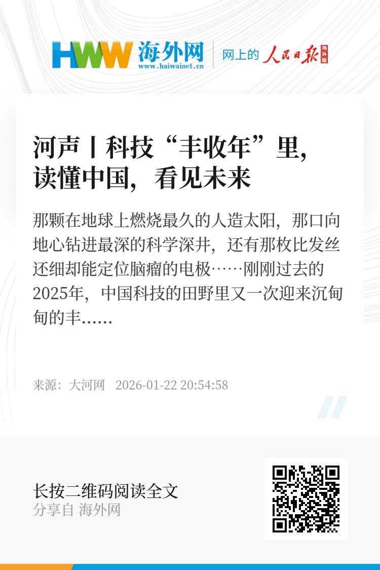 读懂中国科技“丰收年”,就是读懂一个民族在自立自强道路上的坚定跋涉,就是看见一个创新活力奔涌、未来无限可期的中国。这底气,源自制度伟力,成于万众一心,最终归于人民福祉。当科技之光持续照亮强国之路、温暖百姓生活,中国式现代化的壮阔图景必将更加璀璨夺目。(大河网河声评论员 邓随新)