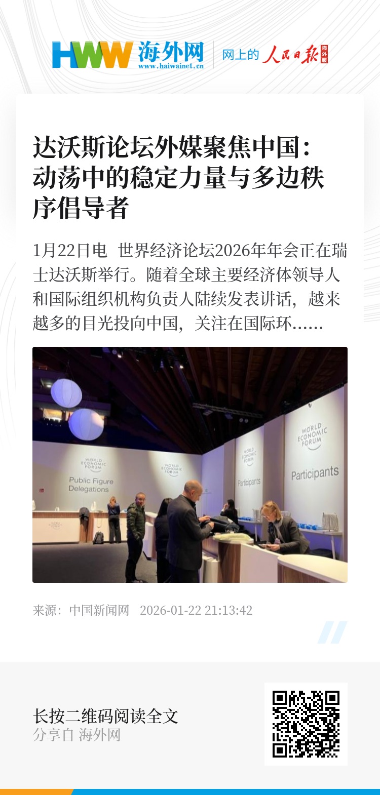 与此同时,欧洲《现代外交》网站提到,中国在达沃斯论坛上的核心经济主张包括实现高质量发展,推动经济增长模式从传统出口导向型转向依靠内需、先进制造业及绿色转型的模式,同时支持全球创新与人工智能领域相关政策制定。中国已多次重申其对开放政策和持续融入全球经济的坚定承诺。